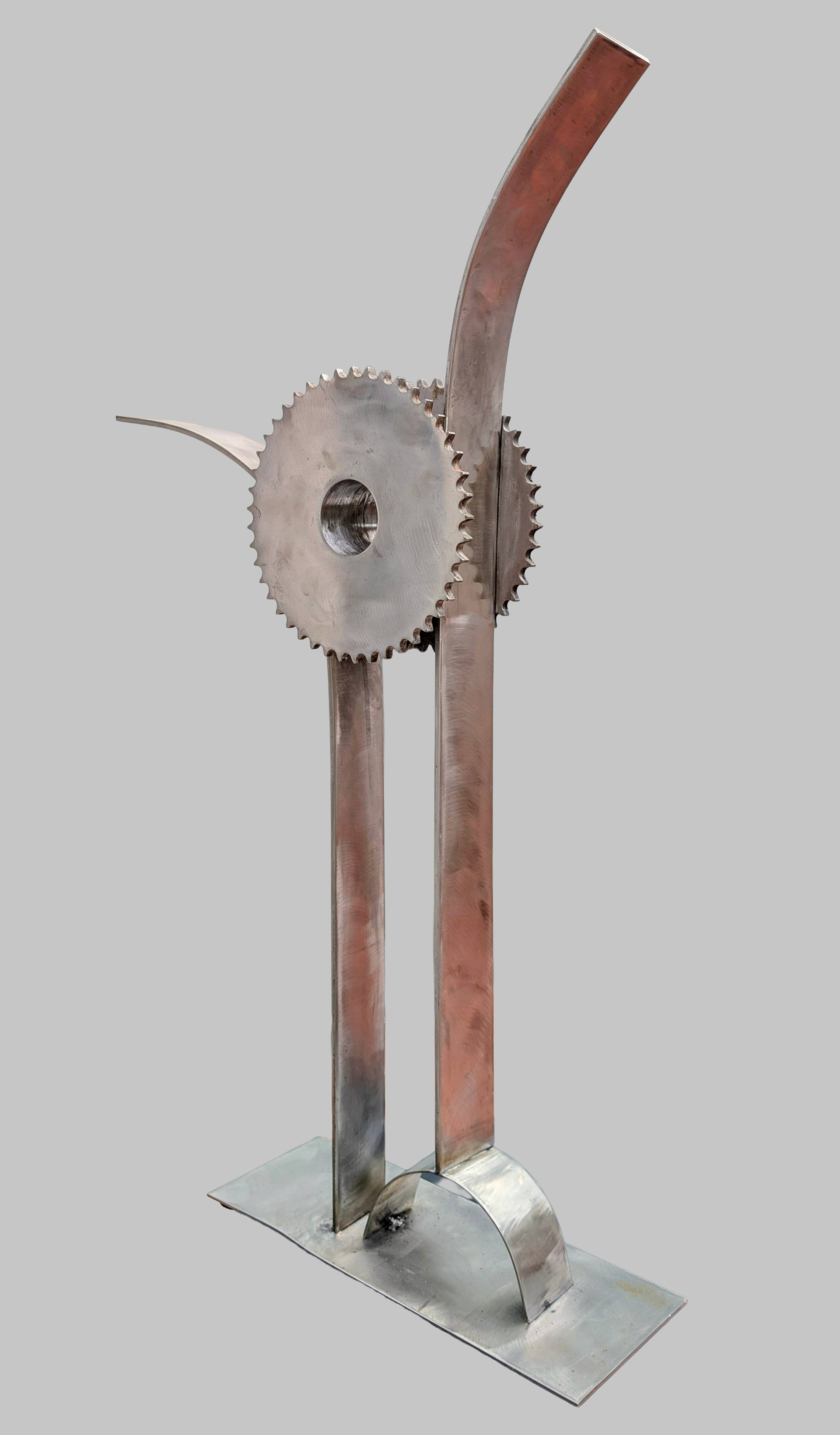 Una figura esbelta y ascendente, articulada en torno a un engranaje central del que emergen dos brazos. La escultura sugiere un gesto de expansión, como si el acero se liberara del peso de su origen para elevarse. Movimiento contenido.
