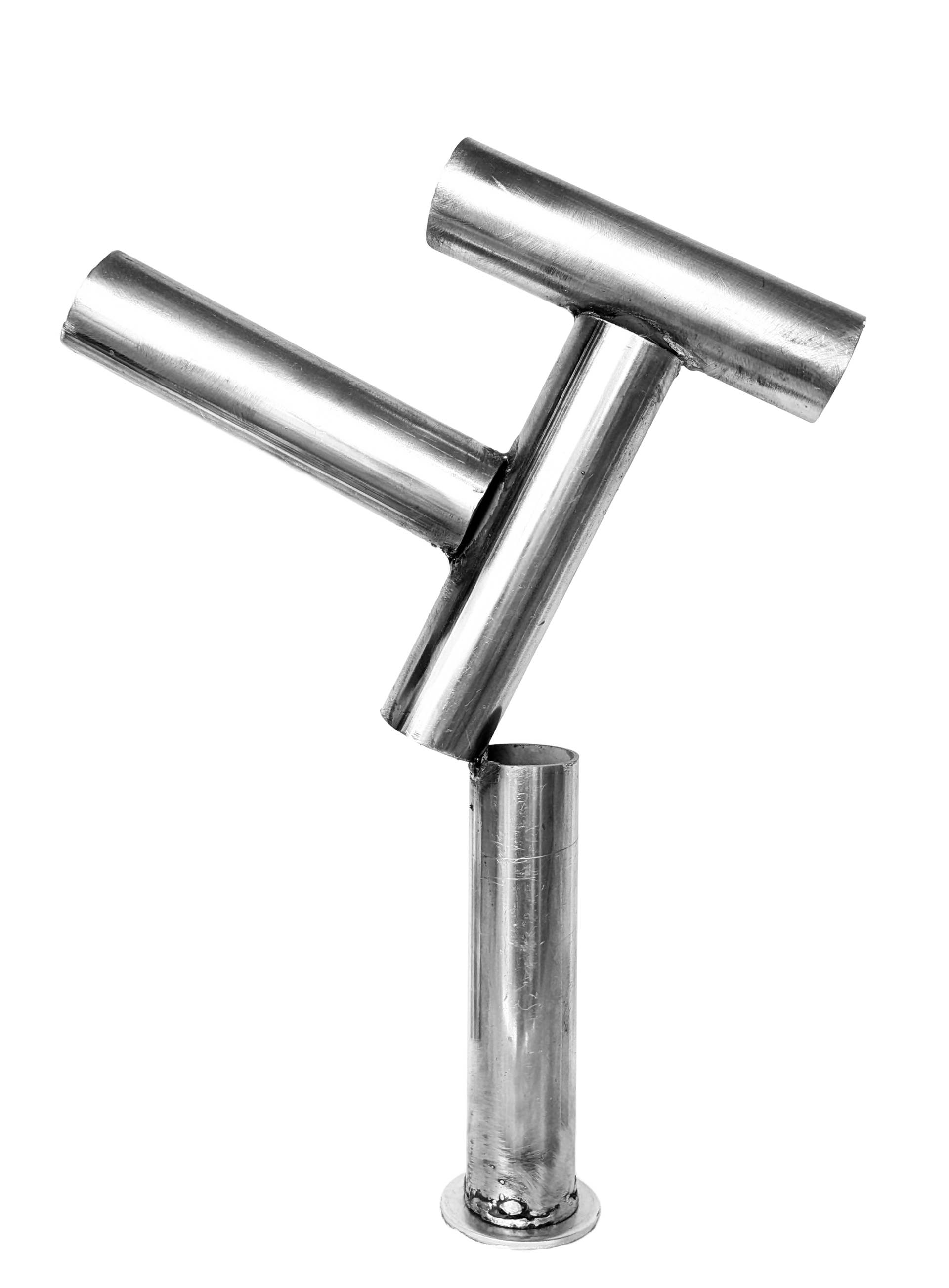 Esta pieza escultórica se compone de tubos de metal unidos en ángulos que parecen desafiar la gravedad. El acabado metálico brillante y la simplicidad de las formas ofrecen una obra que evoca el dinamismo y el movimiento en una estructura estática.