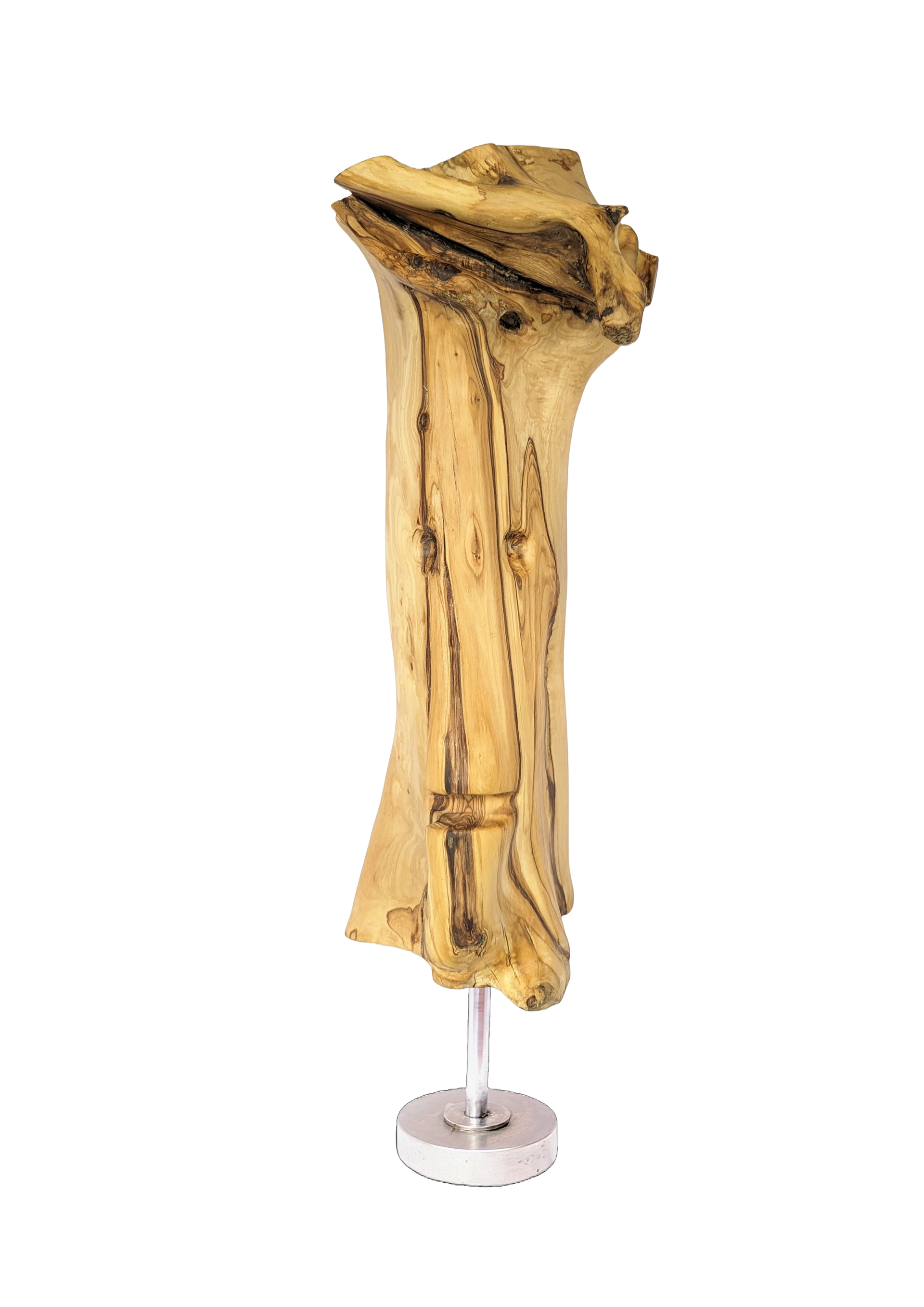 Esta pieza vertical y esbelta destaca por sus líneas elegantes y las suaves transiciones en la madera. La belleza de las vetas de olivo es el foco principal, mientras que la forma estilizada da un toque de sofisticación a cualquier espacio.
